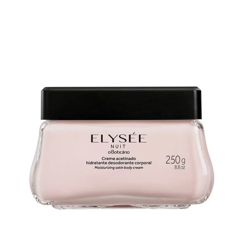 Elysée Nuit Creme Acetinado Hidratante é altamente hidratante e perfumado. O creme acetinado forma uma camada protetora sobre à sua pele, protegendo de agressões externas e mantendo a hidratação por até 48 horas, trazendo uma sensação de leveza e maciez à sua pele. Sua fragrância deliciosa traz toda a sofisticação e ousadia de Elysée Nuit Eau de Parfum que combina rosas damascenas colhidas antes do amanhecer com o toque adocicado do macarron. Família olfativa: Chypre Gourmand.
