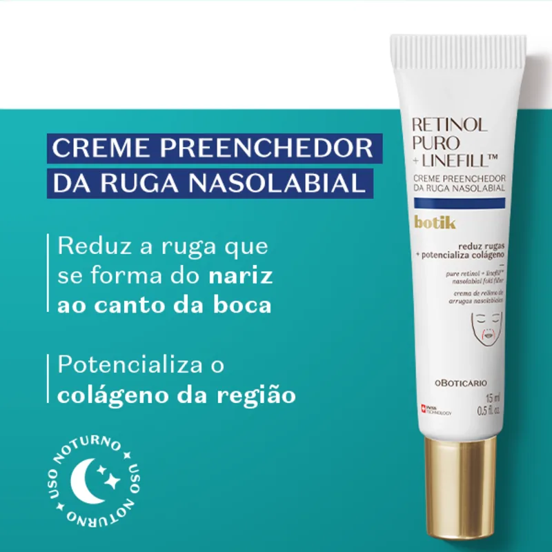 O Creme Preenchedor da Ruga Nasolabial Botik Retinol Puro + Linefill é o produto que não pode faltar na sua rotina de skincare. Ele é um produto de uso localizado que realiza uma dupla ação redutora na ruga que vai do nariz até o canto da boca.