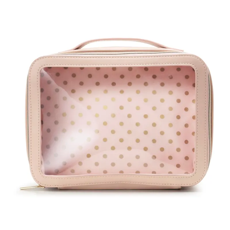 Em tom nude, a frasqueira nude possui alça e parte interior forrada com tecido rosa e póa, deixando o produto ainda mais charmoso! Ela possui um ótimo espaço interno e comporta vários itens. É a frasqueira nécessaire ideal para organizar seus itens! Ideal para presentear, a Frasqueira com Visor pode ser uma linda embalagem de presente!