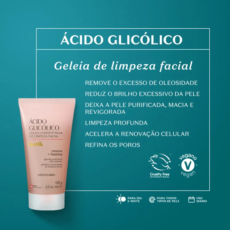 Geleia Concentrada de Limpeza Facial Ácido Glicólico Botik não pode faltar na sua rotina de skin care. Ela acelera a renovação celular e remove as células mortas da primeira camada da pele, deixando-a imediatamente purificada, mais iluminada, viçosa e revigorada.
