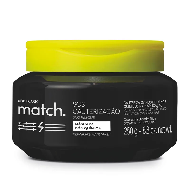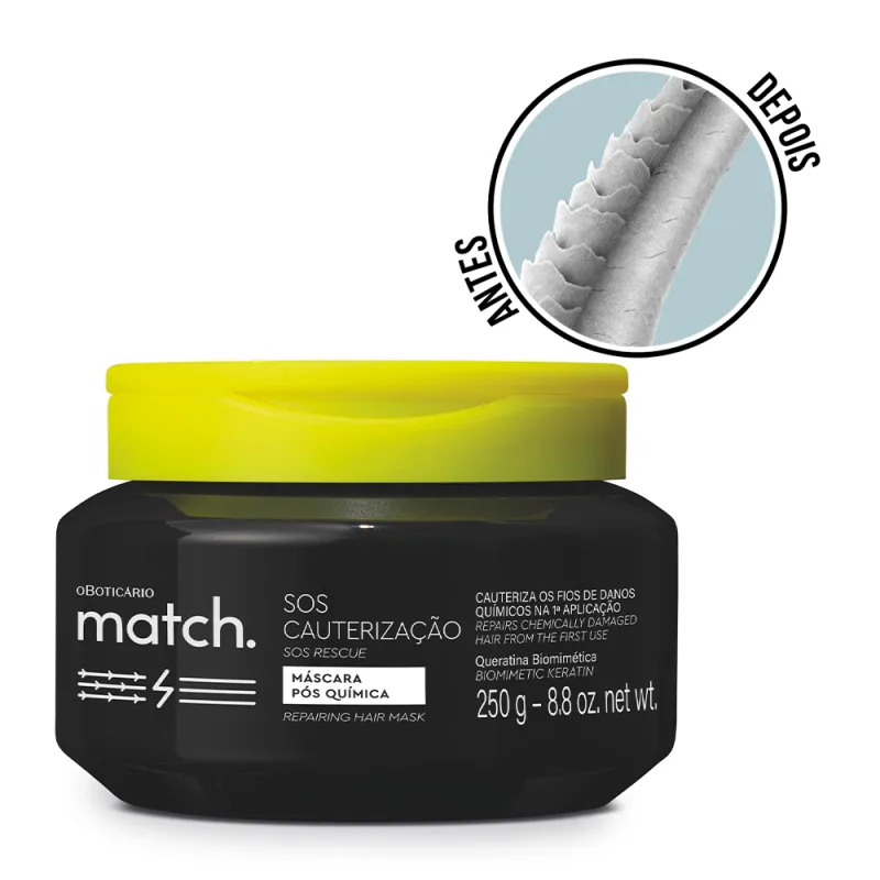 Contando com o Máscara Capilar Pós-Química Match SOS Cauterização e o uso combinado de todos os produtos da linha na sua rotina de cuidados capilares, você repara qualquer dano químico severo desde a primeira aplicação.