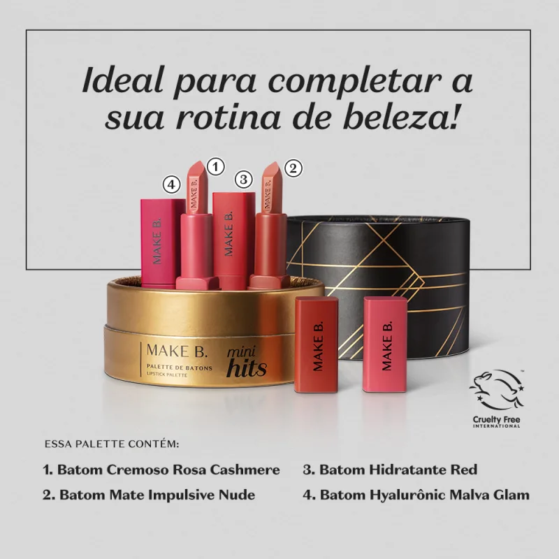 Um produto que é perfeito para completar a sua rotina de beleza parece até sonho, não é mesmo? Mas com a Palette de Batons Make. B Mini Hits é realidade! Seus 4 batons preferidos de Make B. em tamanho mini com cores e texturas diferentes para te acompanhar em qualquer ocasião, olha só: