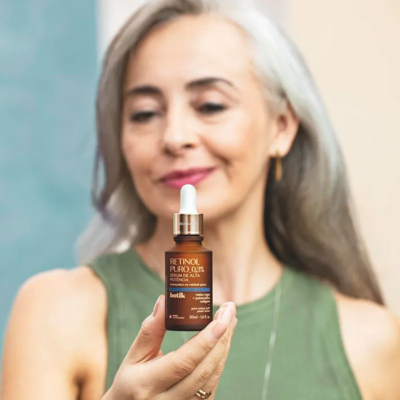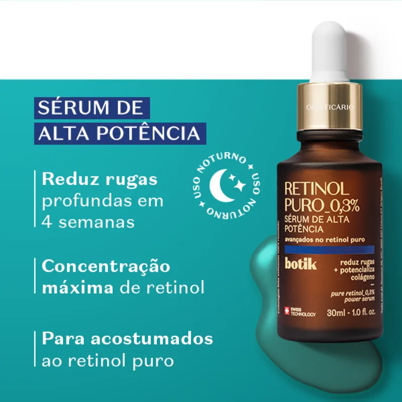 O Sérum Facial de Alta Potência Botik Retinol Puro é o produto que não pode faltar na sua rotina de skincare. Ele conta com uma fórmula composta por ativos de alta performance como o Retinol Puro e Tecnologia Suíça que reduz rugas profundas com resultados a partir da primeira semana de uso.