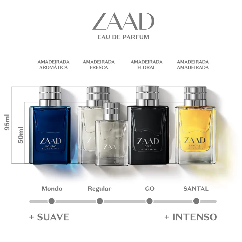 A fragrância masculina de Zaad Mondo combina a nuance levemente frutada do exclusivo acorde Blue Juniper com madeiras frescas e notas aromáticas, trazendo uma sensação que foge do comum.